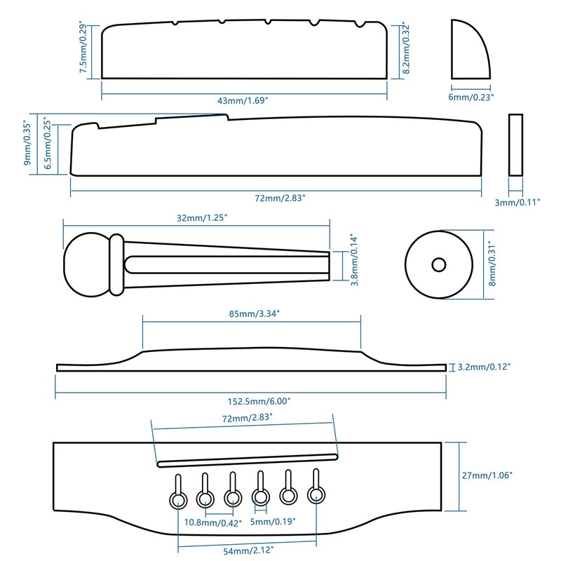 - Package Include: 1 x guitar wooden bridge;1 x guitar nut;1 x guitar saddle;6 x guitar bridge pins.