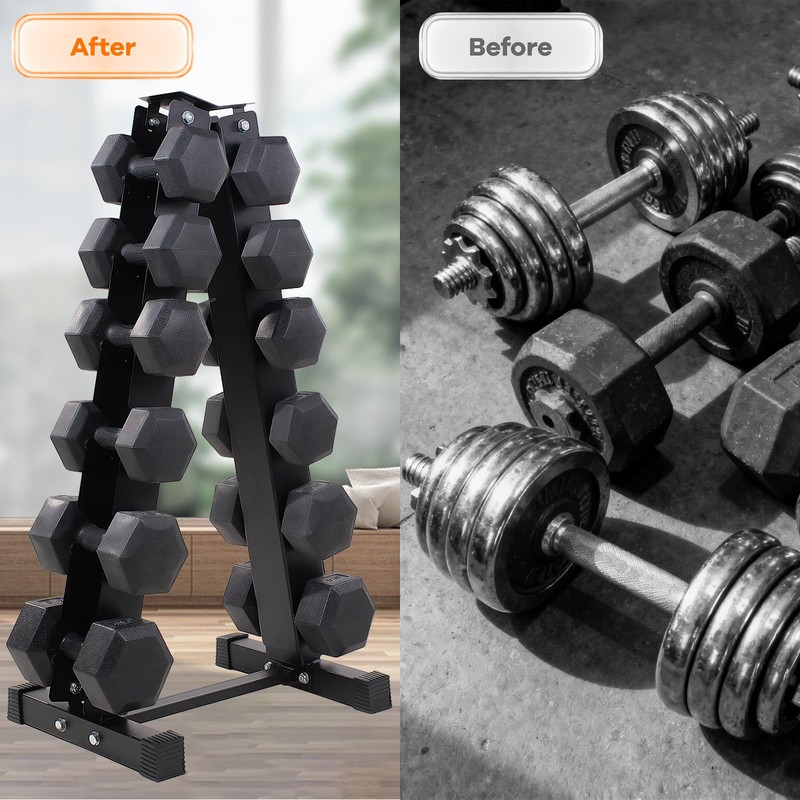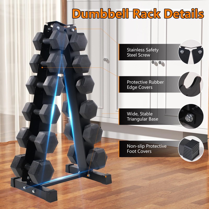 - Space-saving 6-tier design: The A-frame steel tube construction maximizes floor space by storing dumbbells vertically in a compact "A" shape while allowing easy access to your weights.