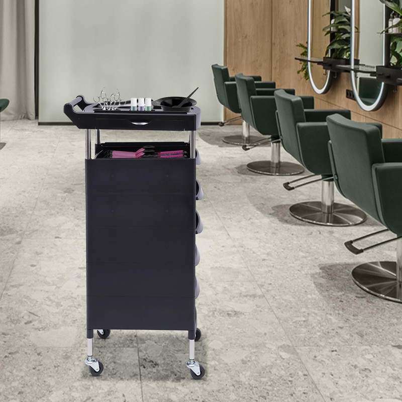 6 Tiers Salon Trolley with Handle and Rolling Wheels, 5 Drawers and 2 Hair Dryer Holder Side Tray, Rolling Salon Station for Beauty, Black