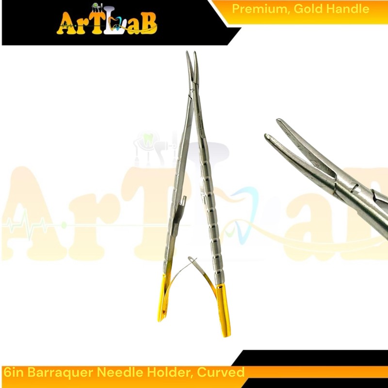 - 6in Castroviejo Needle Holder: The curved jaws provide superior grip and manipulation of fine needles, ensuring accurate needle placement. The integrated lock mechanism secures the needle firmly in place, preventing accidental slippage and enhancing safety.