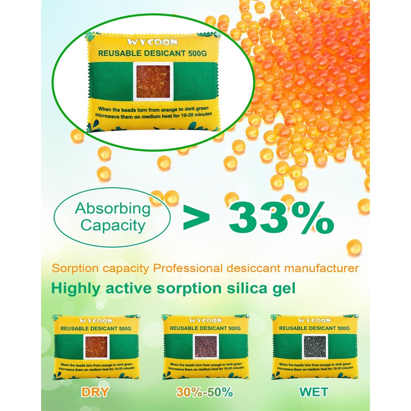 Keep your spaces dry and comfortable with WYCOON’s Rechargeable Desiccant Bags. These high-performance moisture absorbers are perfect for eliminating dampness in cars, closets, basements, garages, and storage areas. Each pack desiccant bags designed with a transparent indicator window for easy monitoring of moisture levels. When the silica gel beads turn from orange to deep green, it's time to reactivate. Simply microwave for a quick and easy recharge. These dehumidifier bags are made from durable, high-quality aramid non-woven fabric, ensuring long-lasting, safe, and efficient moisture control. Protect your valuables, furniture, clothing, electronics, and more with our reusable, eco-friendly desiccant bags!
