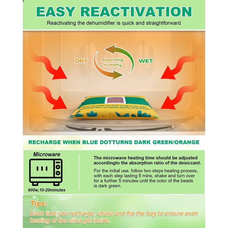 • Fast and Easy Reactivation: Recharging your moisture absorber bags is quick and simple! Just place the bags in the microwave for up to 5 minutes on each side, repeating the process until the beads return to their original orange color. For best results, use low microwave heat (levels 1-3) to ensure safe reactivation and avoid damaging the transparent window. The reactivation time may vary depending on the moisture level and bead condition