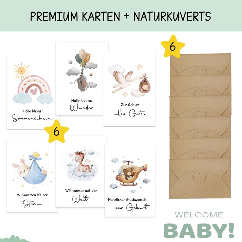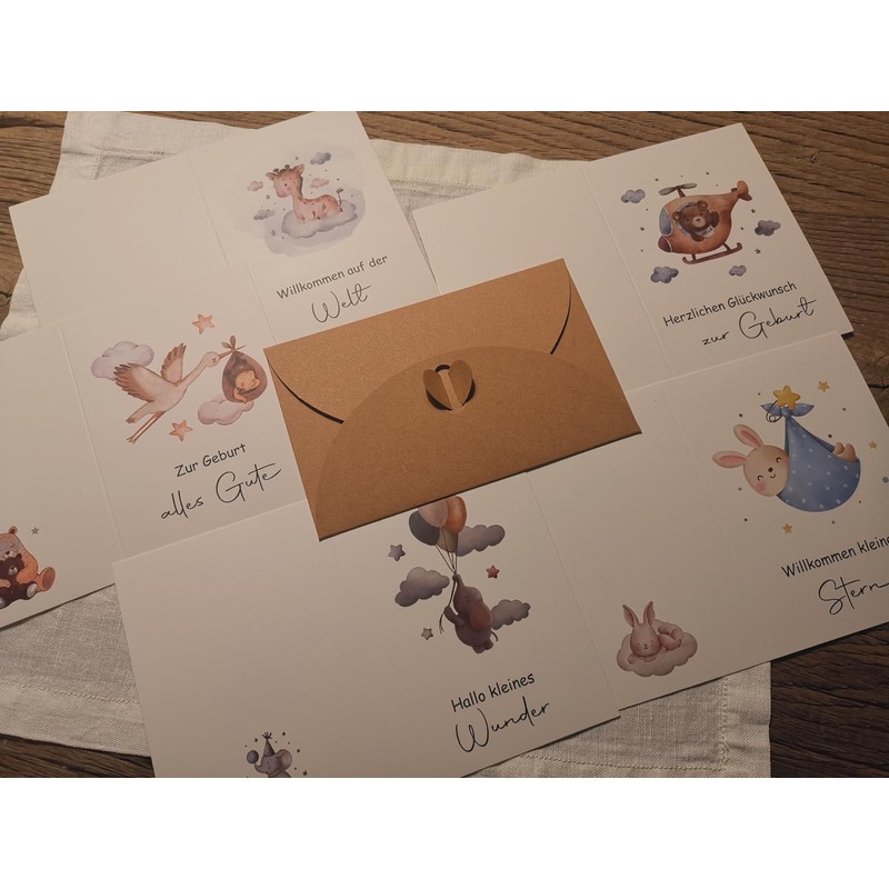 - What you get: 6 x folding birth cards in DIN A6 format and 6 x kraft paper envelopes.