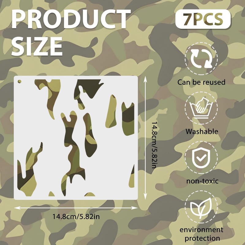 - Complete Camo Stencil Set – Includes 7 unique camouflage pattern stencils, each measuring 6 x 6 inches, offering a wide variety of designs for endless DIY possibilities