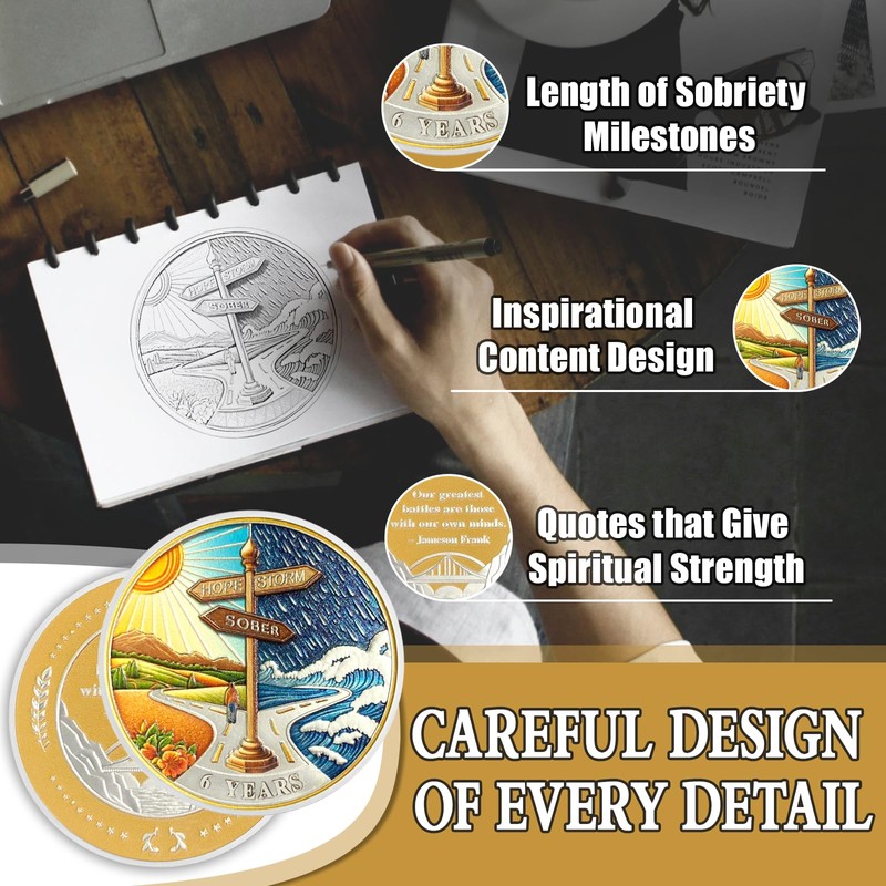 - Impressive Front Design: At the bottom of the obverse of this sobriety coin is an inscription that reads "6 YEARS", which represents the great sobriety milestone of six years that the holder has achieved. The intersection of a fork in the road has a signpost pointing to hope and storms respectively. The sunny fields symbolise hope and the raging storms signify the hardships and challenges of the past. And we are on the road to hope, and perseverance will bring us hope and renewal