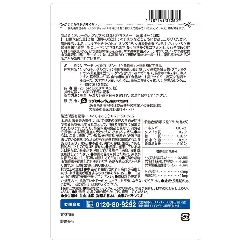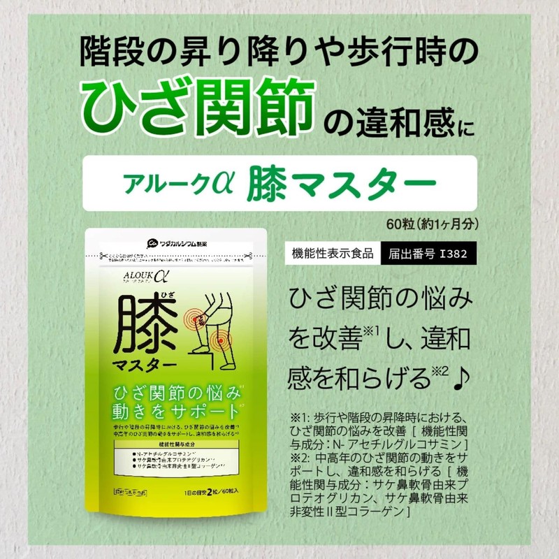 アルークα 膝マスター (ひざ関節の悩みの改善) 60粒 (約30日分) プロテオグリカン コラーゲン N-アセチル グルコサミン 非変性II型コラーゲン 膝サプリ 膝関節 [機能性表示食品] 国内生産 ワダカルシウム製薬 (2袋)