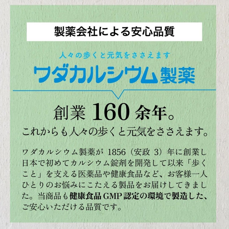 - 🏃🏻【創業110余年 老舗製薬会社 】 ワダカルシウム製薬は,1911年に日本で初めてカルシウム錠剤を製造し、健康にこだわった商品を販売しています。国内工場で製造した高品質の商品のみをご提供した安心安全のサプリメントです。