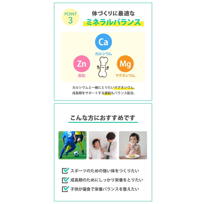 - 【 カルシウム&マグネシウム 】子供の体づくりに大切なカルシウム・マグネシウムを理想バランスで配合。カルシウムの吸収に役立つビタミンDも配合。スポーツ選手に欠かせないビタミンB群や鉄分も配合しています。