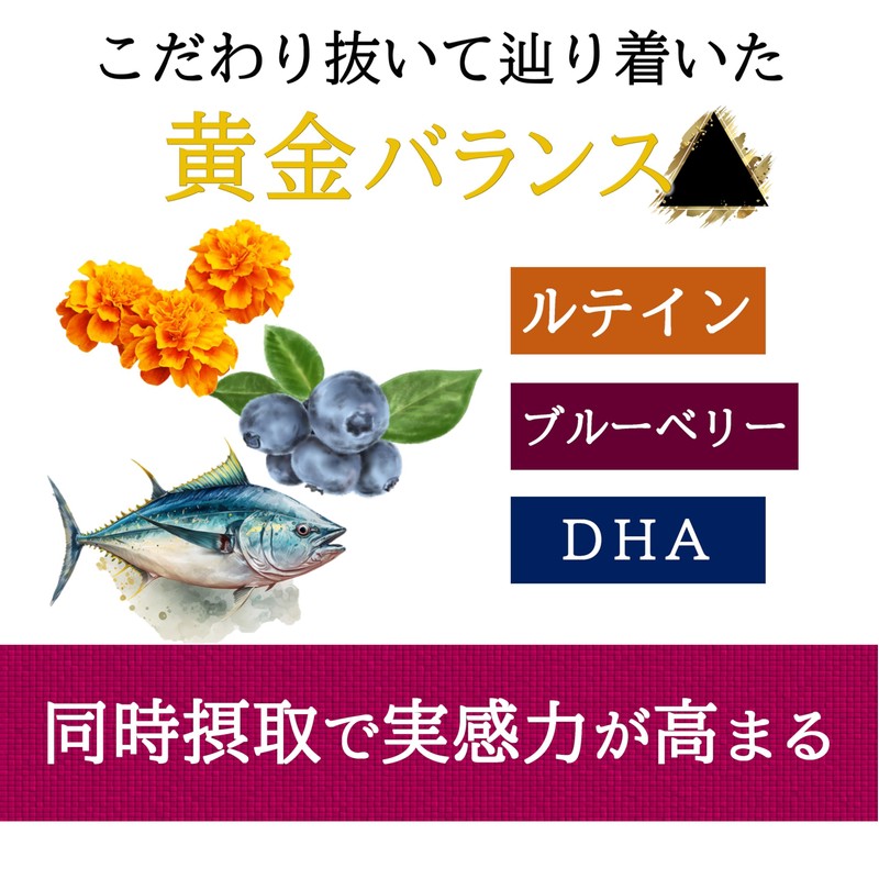 - ✅ルテイン、ブルーベリー、ゼアキサンチン、アスタキサンチンを黄金バランスで配合。