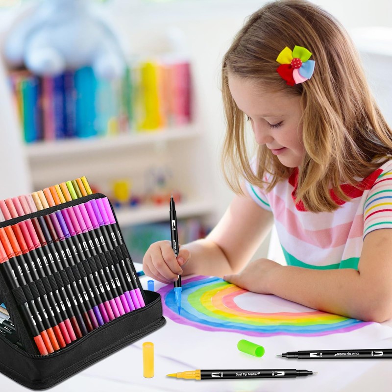 - 【Portable Coloring Pens】:These dual - tip markers are made of high - quality, non - toxic pigments, drying fast and resisting stains. The water - based, odorless, acid - free ink blends with water. Pen caps have safety holes. They come with a portable CD - style cloth bag.