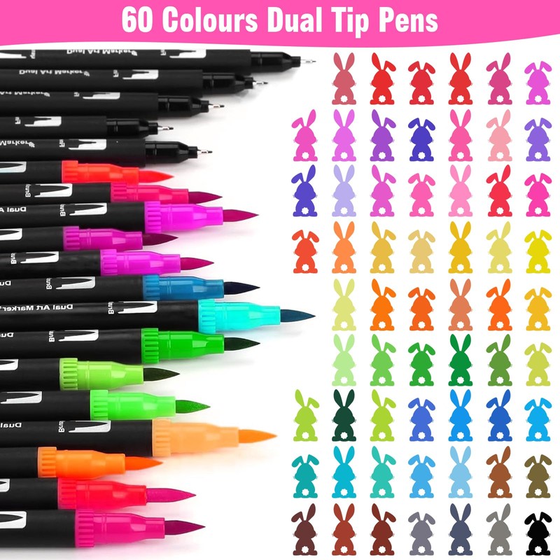 60 Colours Dual Tip Colouring Pens,1-5mm Brush and 0.4mm Felt Tip Pens, Art Markers for Adult Colouring Books Sketching Drwaing