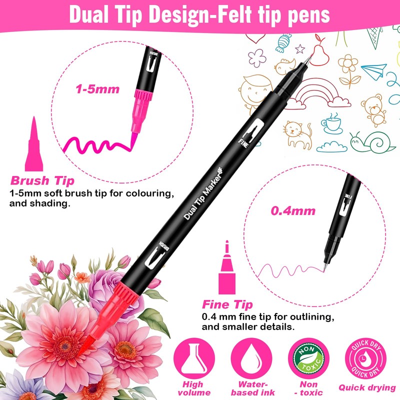 - 2. Dual nib design: Felt tip pens one end is 0.4mm fine nib, colouring pens suitable for sketching fine lines and depicting minute details; the other end is 1 - 5mm brush nib, which is convenient for applying colours to large areas and creating gradient effects. Easy to switch between nibs to meet the needs of drawing, writing and other diversified creative needs, to enhance the creative efficiency.