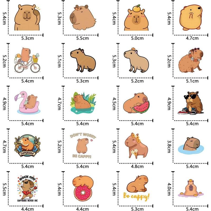 Capybara Stickers: There are 60 count positive capybara stickers in total. The pattern of each sticker is . The size of the stickers are about 1.5"-4".