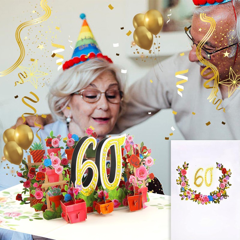 - 【Einzigartiges Design】Die schön,personalisiert, einfach und stilvoll 3D Pop up Geburtstagskarte bringt mehr Überraschungseffekte als herkömmliche Geburtstagskarten, Verbessern Sie die emotionale Verbindung zwischen Menschen. Wenn die Karte geöffnet wird, erscheint sie automatisch als exquisites symbol zum 60.Geburtstag. Mit dem Hinzufügen von Blumen und Blätter wird es der Bringen Sie eine große Überraschung für den Protagonisten der Party!
