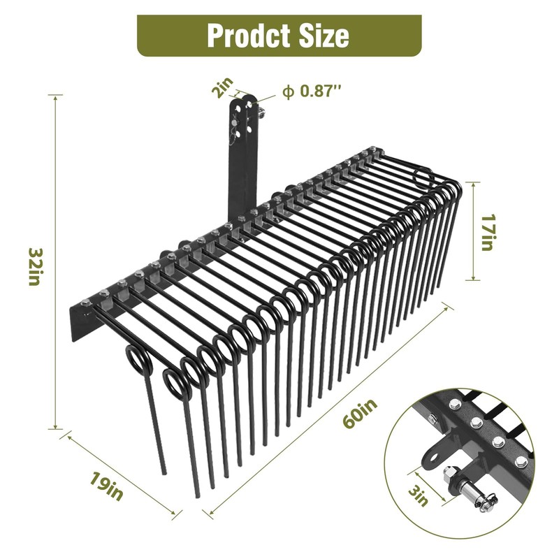 60 Inch Pine Straw Rake, 26 Coil Spring Tines Durable Powder Coated Steel Tow Behind Landscape Rake with 3 Point Hitch Receiver Attachment Fit to Cat0 Cat 1 Tractors for Leaves Grass, Black