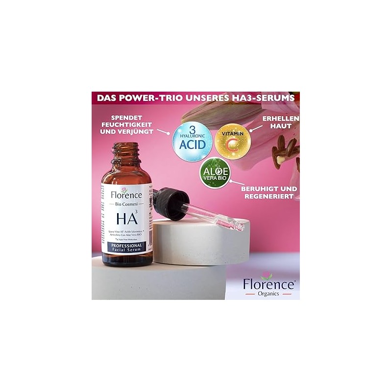 For Radiant Skin: Enhance your skin’s elasticity with Florence's hyaluronic acid serum infused with vitamin C. Designed to refresh and rejuvenate your complexion, this serum works as an effective day or night treatment. Its powerful active ingredients support skin renewal and provide protection against oxidative stress. With high skin compatibility, it can also be used as an eye treatment to reduce dark circles.