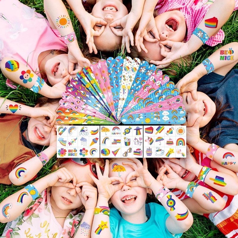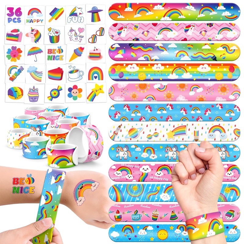 - 🌈 【RAINBOW PARTY FAVOR KIT】24 Slap Bracelets + 36 Tattoos! Kids trade “Rainbow” & “Unicorn” bracelets like trading cards! Plus, exciting rainbow tattoos for treasure hunts!