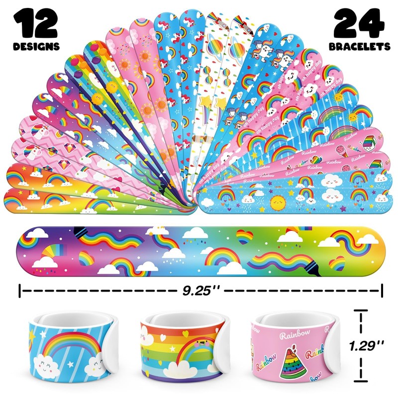 - 🎨 【24 FUN SLAP BRACELETS】 Each bracelet features a vibrant, playful rainbow design – 12 unique patterns to match every party vibe! They snap right on your wrist with a fun “slap” and are perfect for both play and style. They are sure to bring joy to kids (and adults!) of all ages.