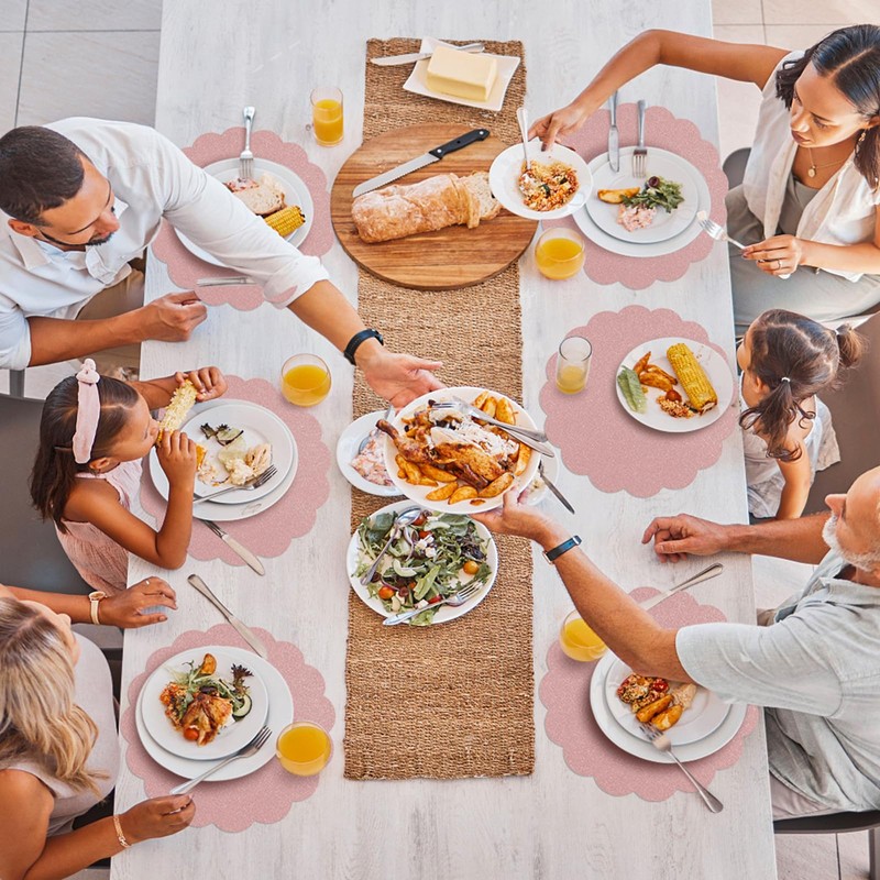 - Note:Due to product craft problems, the placemat may curl during transportation. You can turn the placemat upside down and press it with a heavy object for a while after receiving the goods.