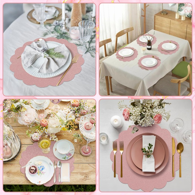 60 Pcs Rose Glitter Paper Placemats, 13.5 Inch Scalloped Disposable Placemats Round Sparkle Table Place Mats Decorative Paper for Birthday Wedding Banquet Party