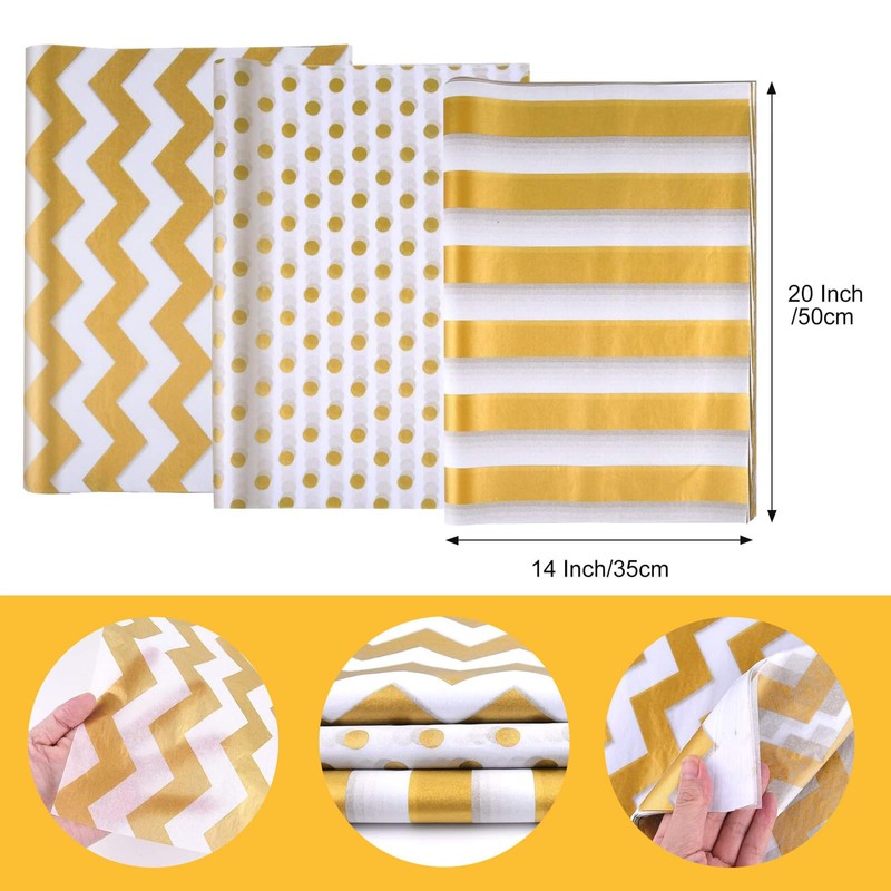 60 Sheets Tissue Paper for Gift Bags, White with Gold Strips, Waves, Dots Art Tissue Paper Bulk for Decoration DIY Crafts Birthday Wedding Packaging, 14 X 20 Inch