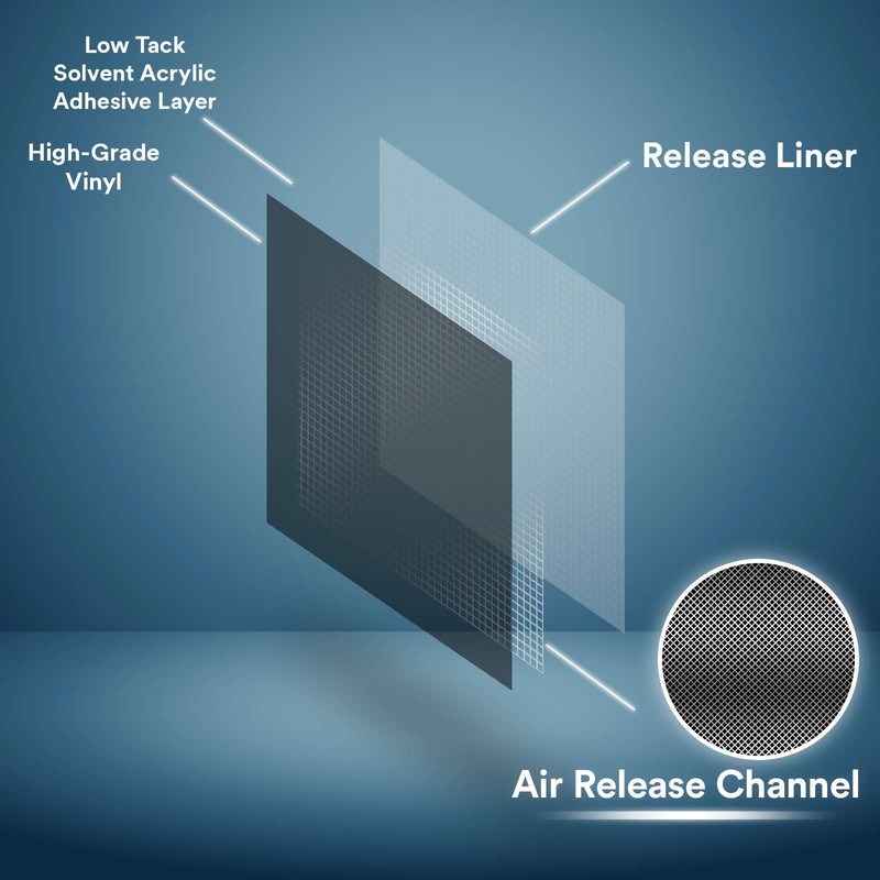 - Bubble free air release channel. Self adhesive peel and stick. Resists most mild acids, mild alkalis and salt
