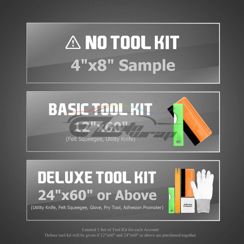 - We provide a free tool gift set for the size larger than 4"x8" size. Size 4”x8” DO NOT come with Tool Kit. Size of 12”x60” Include 1 set of Basic Tool Kit. Size 24”x60” and above Include 1 set of Deluxe Tool Kit. And we Limited 1 Set of Tool Kit for each Account ONLY regardless of quantity purchase. Deluxe tool kit will be given if 12"x60" and 24"x60" or above are purchased together