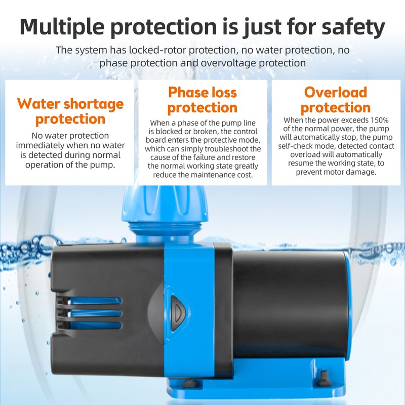 【Multiple Protections】: This DC submersible pump is equipped with multiple protections, including water shortage protection, overload protection, and phase loss protection. These safety features ensure the longevity of the pump and prevent any potential damage.