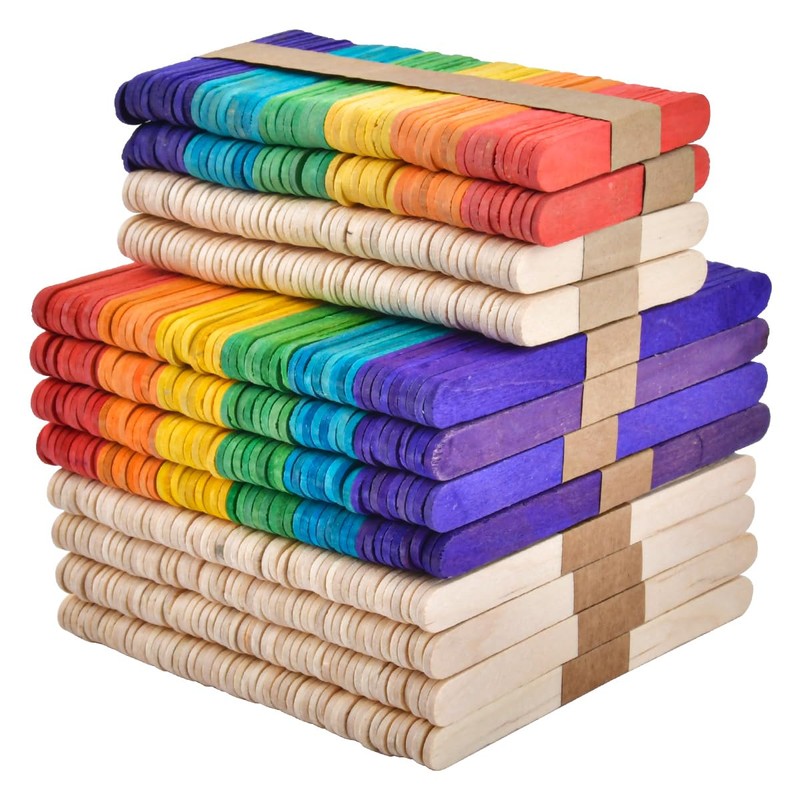 - 【Size - Lollipop Stick Mixed 600PCS】 The length of Giant Lollipop Sticks are 4.5" (11.4cm), Mini Lolly Sticks 2.5" (6.4cm), the width is 0.35" (9mm), height 0.07"(2mm). Large lolly sticks for craft: 200PCS wood color + 200PCS multicolor. Mini lollipop sticks for crafts: 100PCS wood color + 100PCS multicolor. (NOTE: Natural Wood Lollipop Sticks can be used for Ice Cream, but these colorful sticks are NOT Suitable For Ice Lollies, only just for DIY supplies)