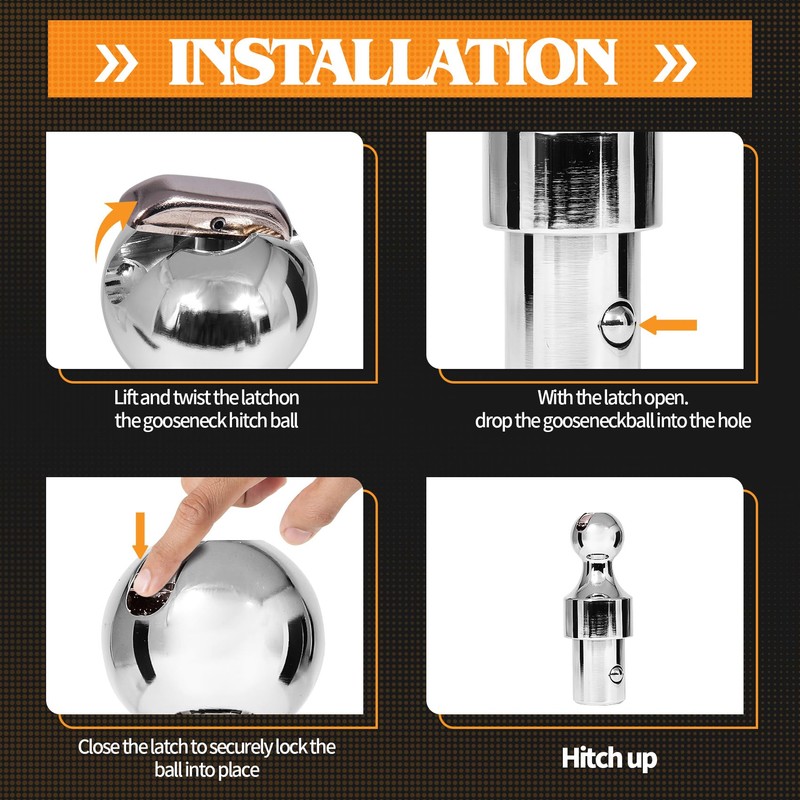 - Easy To Use: Our gooseneck trailer hitch ball kit can directly install it yourself, the same size as the original parts. The gooseneck hook adopts a plug-in installation method. The elastic ball locking device can firmly lock the gooseneck hook on the car. No tools are required for installation