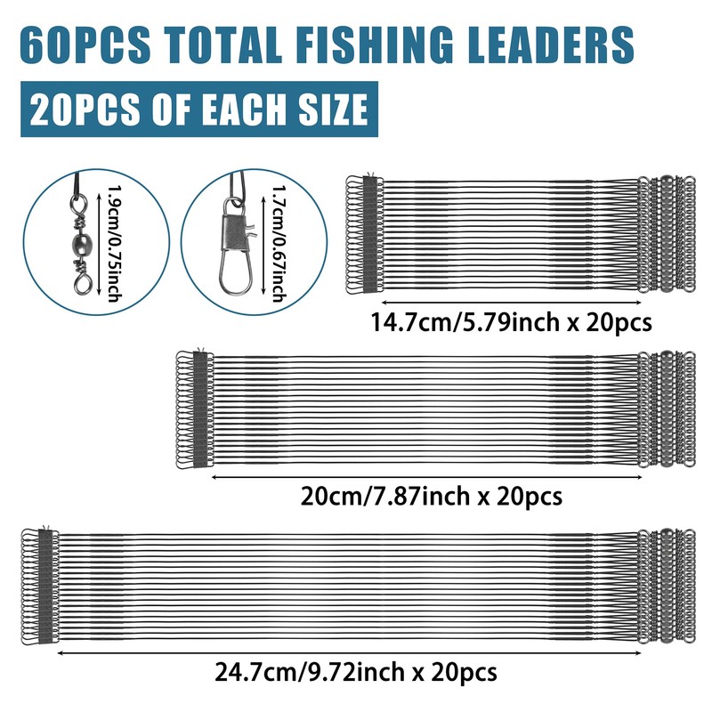 - 【What You Ger】60pcs stainless steel leader wire you will get,size include 5.79inch(14.7cm),7.87inch(20cm),9.72inch(24.7cm),20pcs for each size. 3 kinds colors you can choose:Black/Silver/Green.