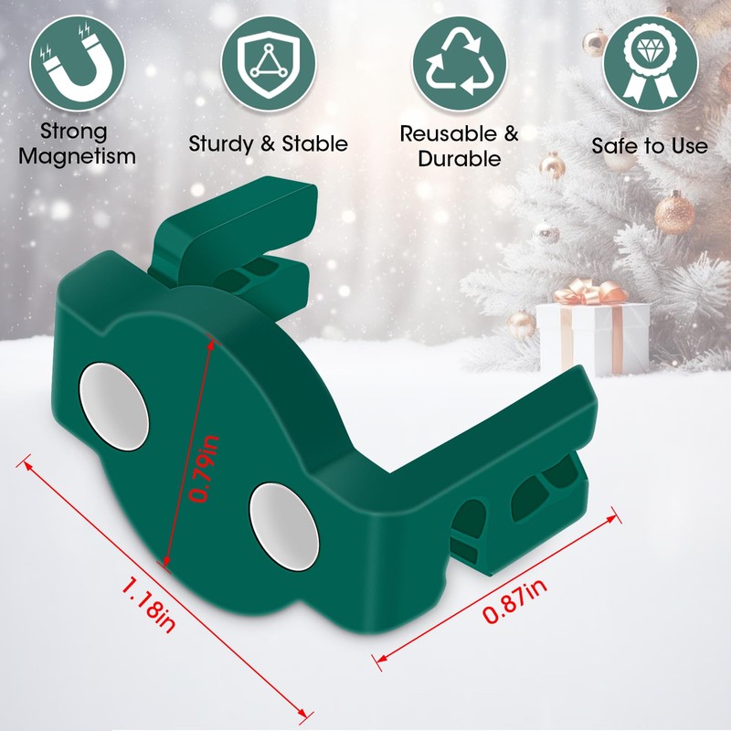 - STRONG MAGNETIC ATTRACTION FIRMLY GRASPS: The magnetic christmas light clips have two small strong magnets that can firmly fix the C9 lights on the metal surface, keeping them in the appropriate position and correctly oriented. The hanger part of the hook is also bendable, making it easy to use thicker cables or wires, and can also be used to hang Christmas decorations