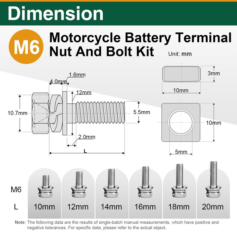 - Battery Terminal Nut Size: These battery terminal nuts are 10 x 10 x 3.2 mm/0.39 x 0.39 x 0.12 inches in size, while the bolts come in 6 different sizes (6 x 10 mm/ 0.24 x 0.39 inch, 6 x 12 mm/ 0.24 x 0.47 inch, 6 x 14 mm/ 0.24 x 0.57 inch, 6 x 16 mm/ 0.24 x 0.63 inch, 6 x 18 mm/ 0.24 x 0.71 inch, 6 x 20 mm/ 0.24 x 0.79 inch), These can meet all your needs