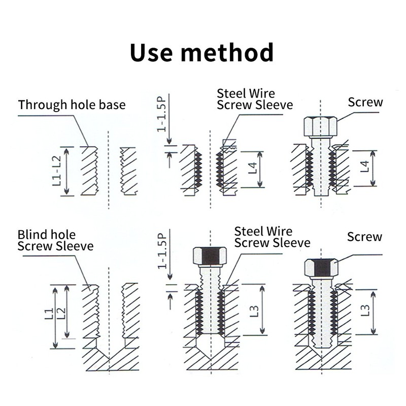 - Wear Resistant: Used for frequent disassembly, it can greatly improve the life of thread. The damaged screw holes shall be put into the wire screw sleeve , which can be used again to avoid the possibility of damage to the workpiece.