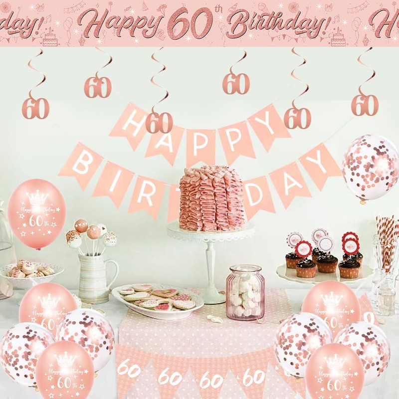 - 60th Birthday Decorations--Rose gold 60 years birthday decoration contains many trendy element and vibrant colors, there are confetti balloons, long birthday banner, and unique foil hanging swirls,adding more joyful birthday atmosphere.