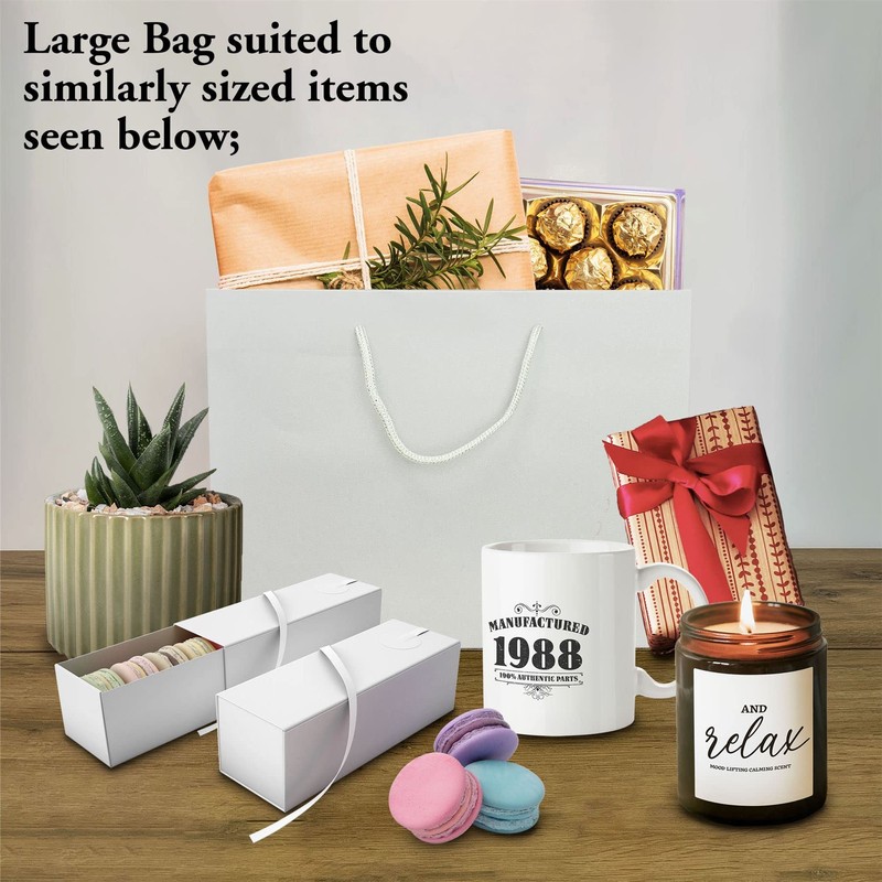 - EXTRA STRONG: Paper thickness approx 230 micron. the stiff matte paper design is surprisingly strong and can carry lots of birthday gift ideas such as sweets, books, ornaments, clothing, jewellery, perfume and many other birthday gift accessories for Women and Men the stiff matte paper design is surprisingly strong and can carry lots of birthday gift ideas such as sweets, books, ornaments, clothing, jewellery, perfume and many other birthday gift accessories for Women and Men