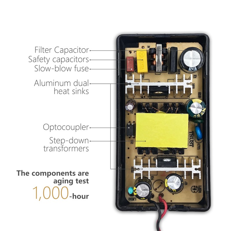 To output a stable and full-rated current, the converter must use components with sufficient capacity. Converters using cheap components will result in an insufficient and unstable output current, causing electrical appliances to not work properly or work weakly, even damaging the appliances, shortening their lifespan, and posing safety hazards.