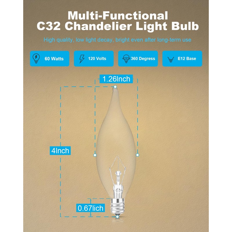 - Specifications and Service: B10 E12 candelabra screw base bulb, 110V-120V / 60 watts / 600 lumens /dimmable / 2700K warm white clear incandescent bulb.