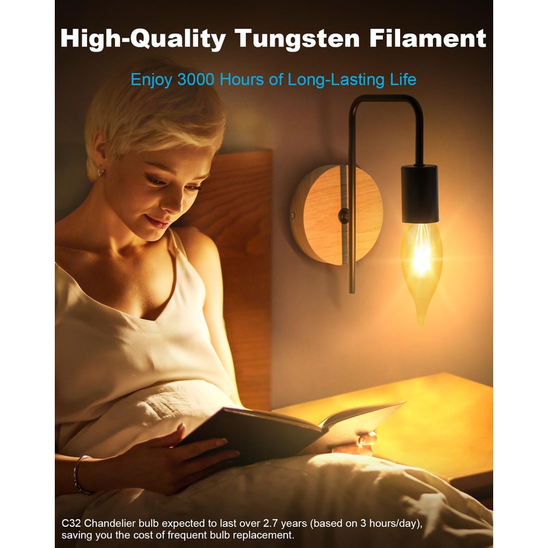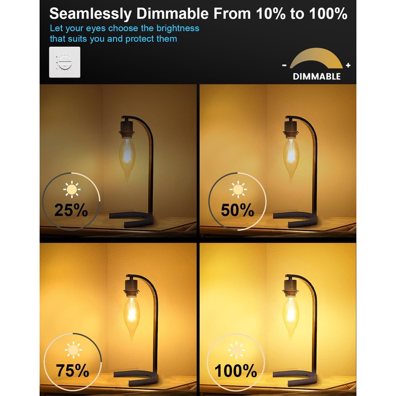 - Advanced Dimming Performance: Our E12 candelabra bulbs use the latest light source technology for precise and stable brightness control from high to low. By adjusting the brightness, you can create various lighting effects to suit different scenarios, enhancing user comfort. Additionally, setting the brightness to an appropriate level can reduce glare and eye strain