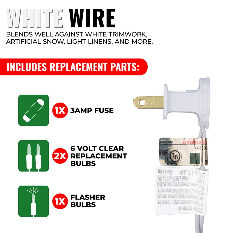 Our 612 Vermont short white wire Christmas lights are ideal for holiday decorating, crafts, weddings, events, parties, centerpieces, etc. Choose from 35 or 20 light count. The 35 light set features 6.1 foot of lighted length and 7.5 foot of total length. The 20 light set features 3.4 foot of lighted length and 4.9 foot of total length. 18" lead cord with one plug end (male and female end on the 1 plug). UL approved for indoor use only. 35 light set is rated 15.6W. 20 light set is rated 9.6W. Do not exceed 216 watts connected end to end. Replace 35 light bulbs with 3.5 volt, 0.46 watt lamps. Replace 20 light bulbs with 6 volt, 0.48 watt lamps.