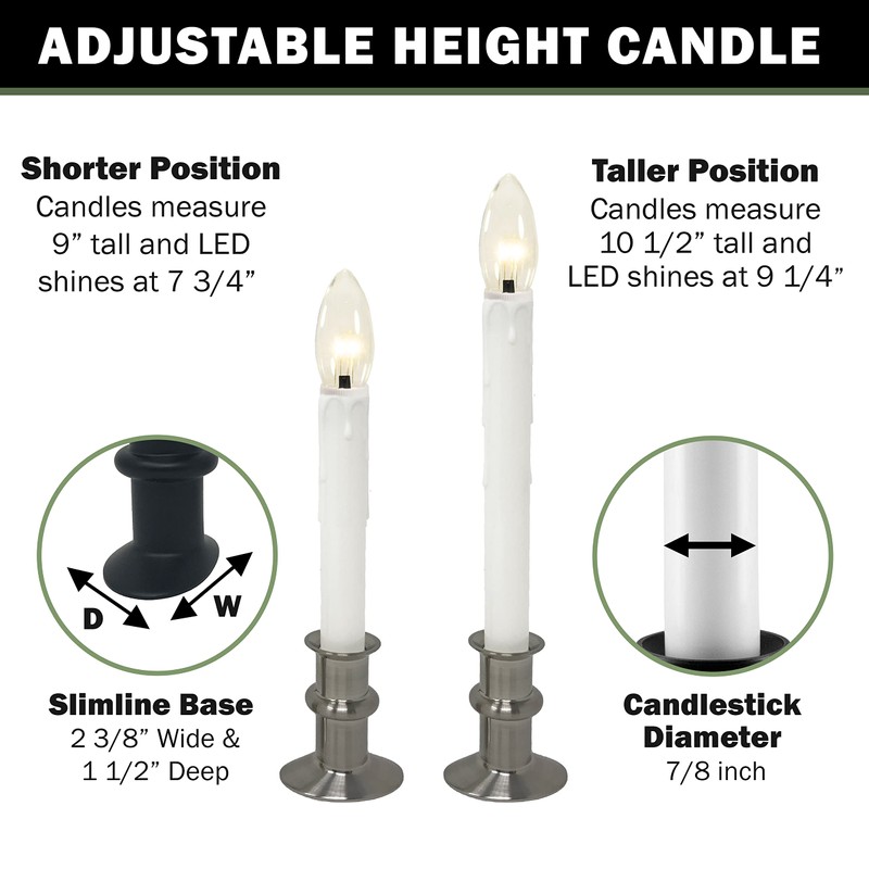 Building on our standard Ultra-Bright LED window candle we bring you an upgraded, feature-rich version. First, we have narrowed the metal base to accommodate thin windowsills. The metal base measures 2-3/8” wide and only 1-1/2” deep. Second, we have added a remote to control each candle. Select from twinkle or steady-on LED light and 3 different 24 timer cycles (6 On/18 Off, 8 On/16 Off, 12 On/12 Off). We only use 3 batteries in the candlestick instead of 4 to save users a little money. This does shorten the candlestick a little, but it is still adjustable to two different heights. Choose from the shorter position of 9” tall with an LED that shines at 7-3/4”, or the taller position of 10-1/2” tall with an LED that shines at 9-1/4”. The candlestick still measures 7/8”. Replacement bulbs available, item number VT-9227-R4-W.