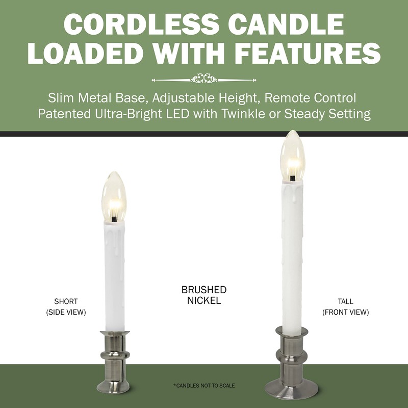 612 Vermont Ultra-Bright LED Window Candles with Timer, Remote Control, Twinkle/Steady LED Light, Battery Operated, Slim-Line Metal Base, Adjustable Height, VT-9167-R4-BNW (Pack of 4, Brushed Nickel)