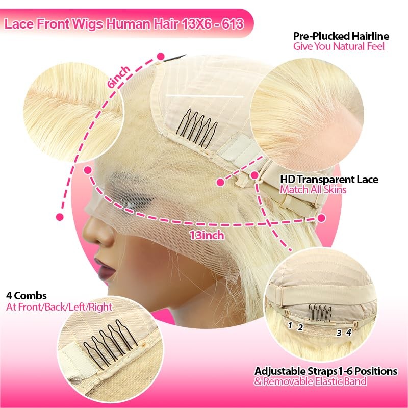 - 613 Lace Front Wig Human Hair Material: unprocessed virgin 613 13x6 lace front wig human hair, 100% human hair wig, cut from young girls, true to length, no smell, no shedding, no frizzy, healthy and comfortable