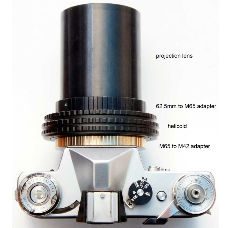 · This adapter allows using LOMO projection lenses that have 62.5mm barrel diameter on Chinese focusing helicoids with M65x1 screw thread. Such setup is great for portrait and macro shots.