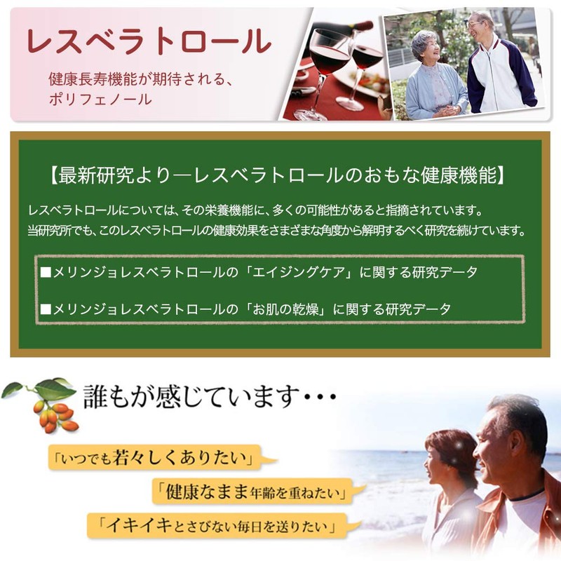 メリンジョ由来の健康成分「レスベラトロール」は4種類以上のレスベラトロールを含み、体内に長くとどまることが自社の研究データから明らかになりました。その魅力の成分に、さらに相乗的な作用を生み出すため、当社が様々なレスベラトロールの組み合わせを研究。独自の配合(※)を導き出し、ブドウ由来のレスベラトロールをプラスしました。1日目安2粒で「35mg」ものレスベラトロールを摂取できます。いつまでも若々しくイキイキと過ごしたい方におすすめです。