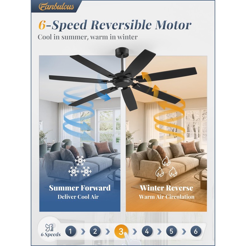 - Ultra-Quiet Motor, Year-Round Comfort: Features a reversible ultra-quiet motor with noise levels below 35 decibels, ensuring a peaceful environment. The unique reverse rotation function not only delivers cool air in summer but also promotes air circulation in winter, making it an ideal ceiling fan for living room or outdoor spaces