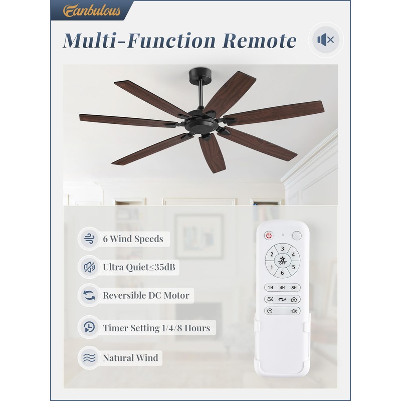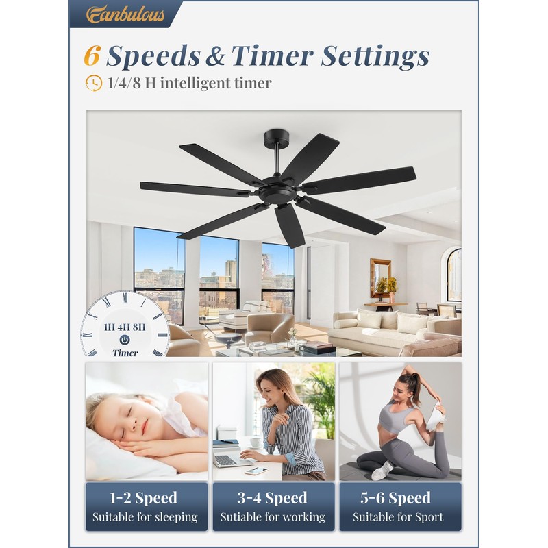 - Smart Remote Control, Effortless Mastery: Equipped with a multifunctional remote control, this 62-inch modern ceiling fan allows you to easily adjust 6-speed settings to meet various needs. The 1/4/8-hour timer, combined with the fan speed memory function, automatically restores your preferred settings every time you turn it on, offering convenience and thoughtfulness