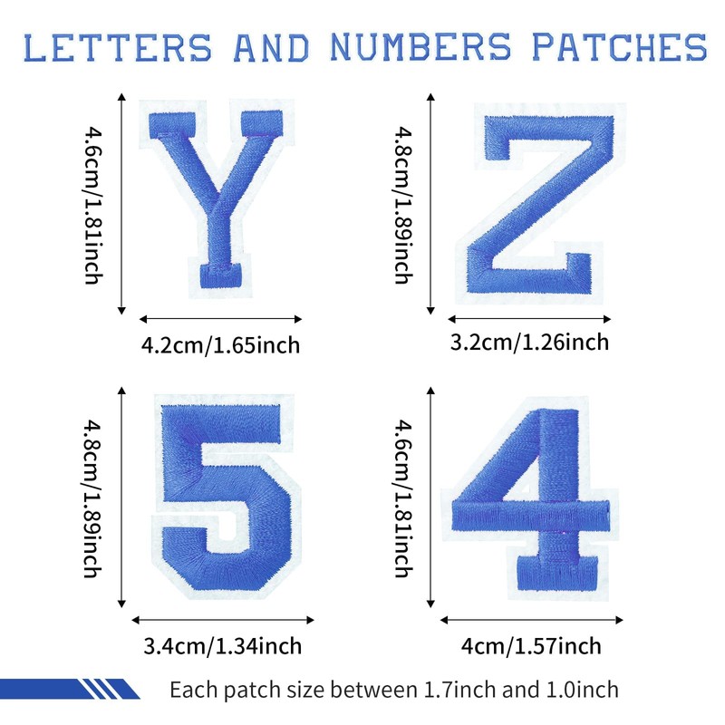 - Product Size: From the smallest alphabet appliques measuring 1.2*4.8cm/0.47*1.89inches to the largest jersey letters measuring 5*5cm/1.97*2.17inches, and the smallest iron on numbers measuring 2.2*4.8cm/0.87*1.89inches to the largest number patches measuring 3.4*4.8cm/1.34*1.89inches, our patches come in a range of sizes to suit various DIY projects.