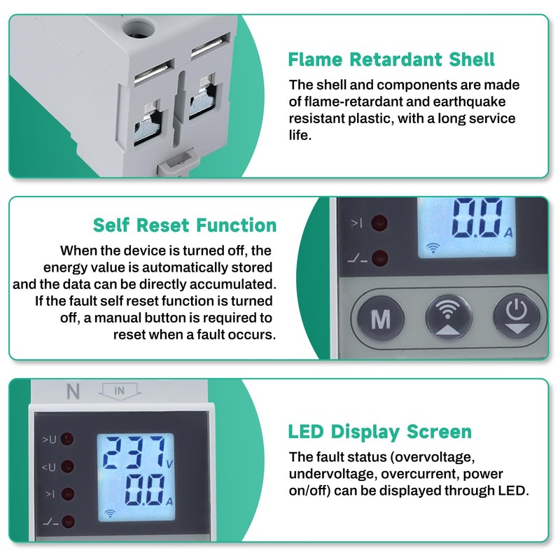 - LED display: Smart switch configure a special measuring chip to detect current and voltage. The digital screen intuitively displays the value of the working voltage and current value, and the error status (over voltage, undervoltage, over current, current on/off) can be displayed by LED.