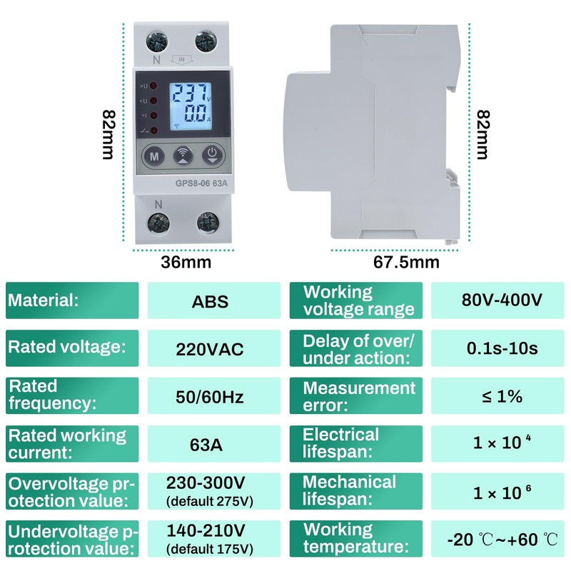 - GPS8-06 WiFi switch: rated voltage: 220V AC, rated frequency: 50/60Hz, rated operating current: 63A, surge protection value: 230-300V (standard 275V), undervoltage protection value: 140-210V (standard 175V), over/undervoltage value and over-current value can be adjusted. Dual bus wiring design, stronger capacity.